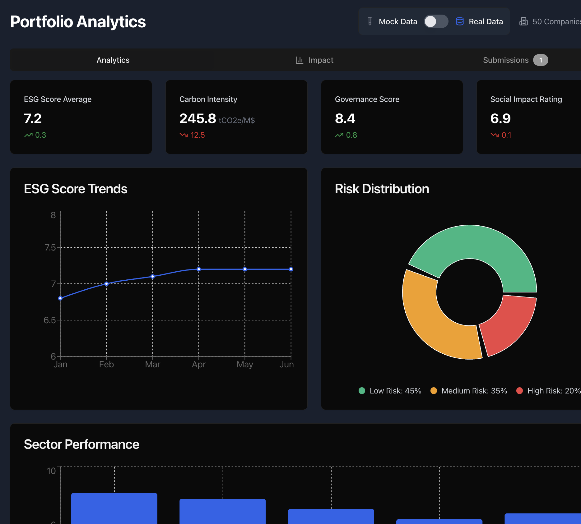 E.A.R.T.H includes a dedicated Investors Module that enables investors to easily track, compare, and manage the ESG performance of their entire portfolio. It provides real-time insights, risk flags, compliance status, and improvement trends across all portfolio companies—helping investors make informed, responsible, and data-driven decisions.